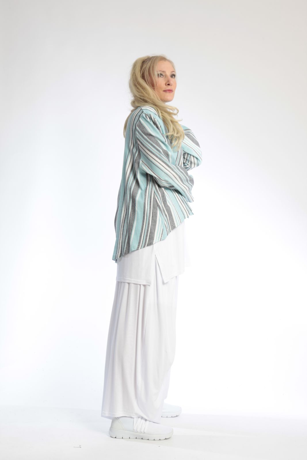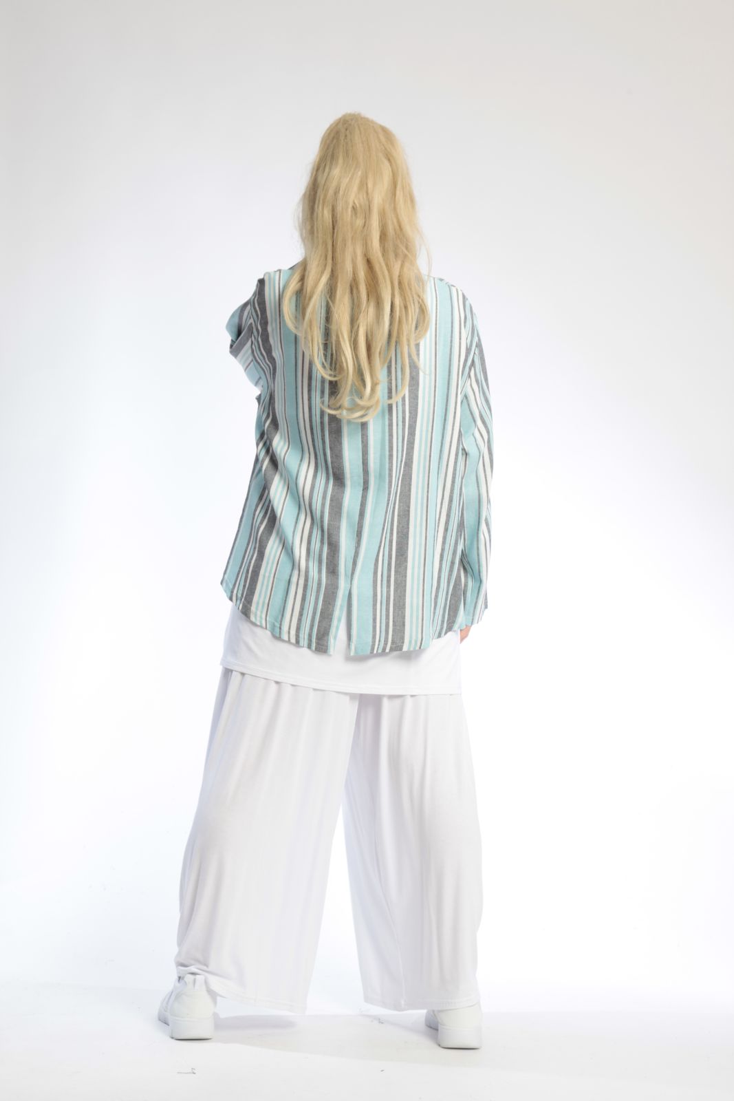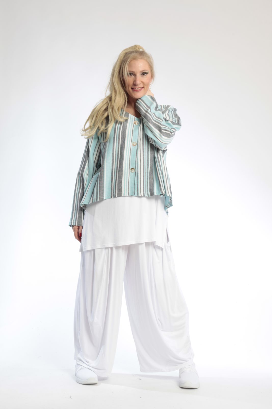 AKH Sommer Jacke in gerundeter Form aus er Leinen Optik Qualität, Türkis. Einheitsgröße, passend bis EU-Größe 50, wird gern auch von Kundinnen mit kleineren Größen oversized bzw. locker, leger getragen.