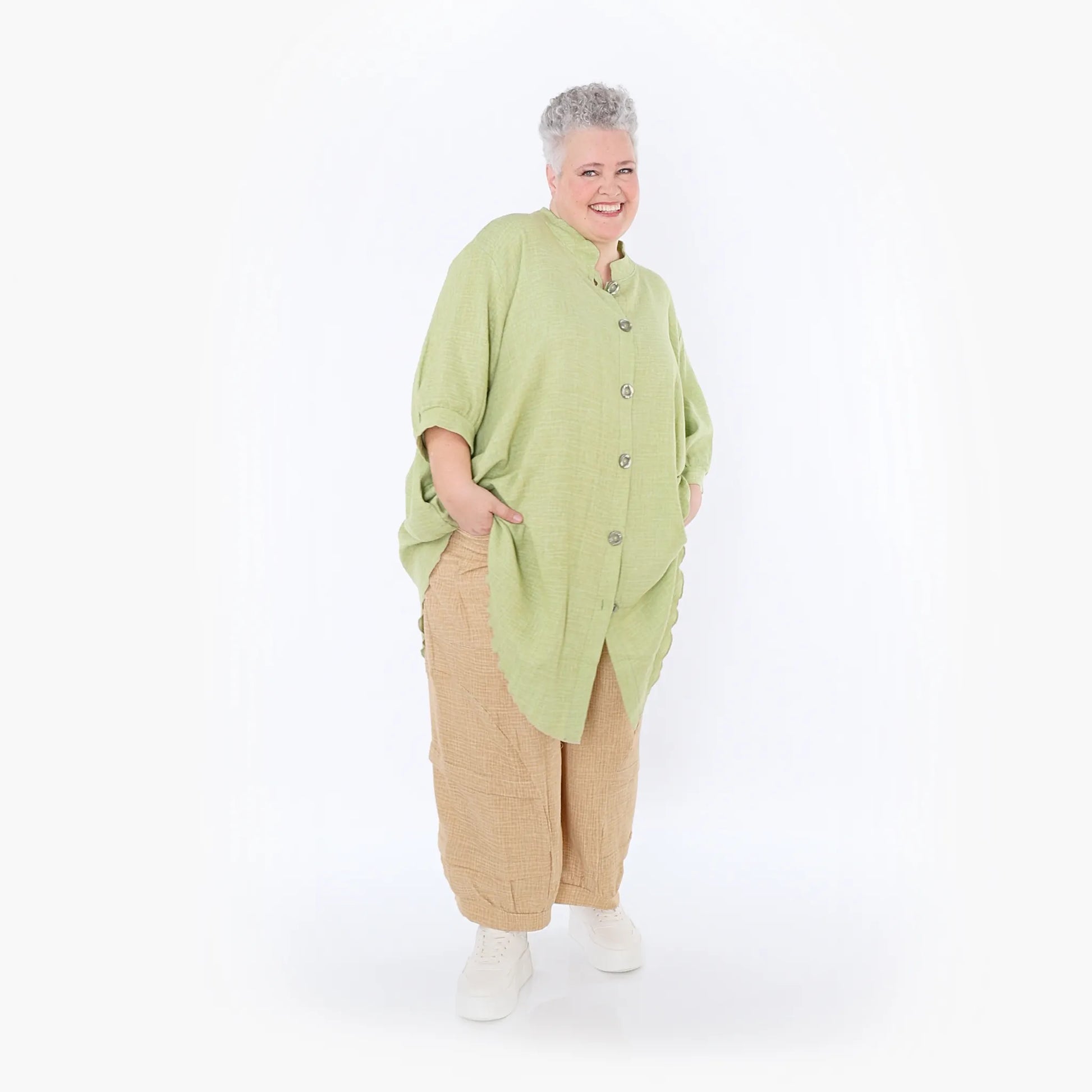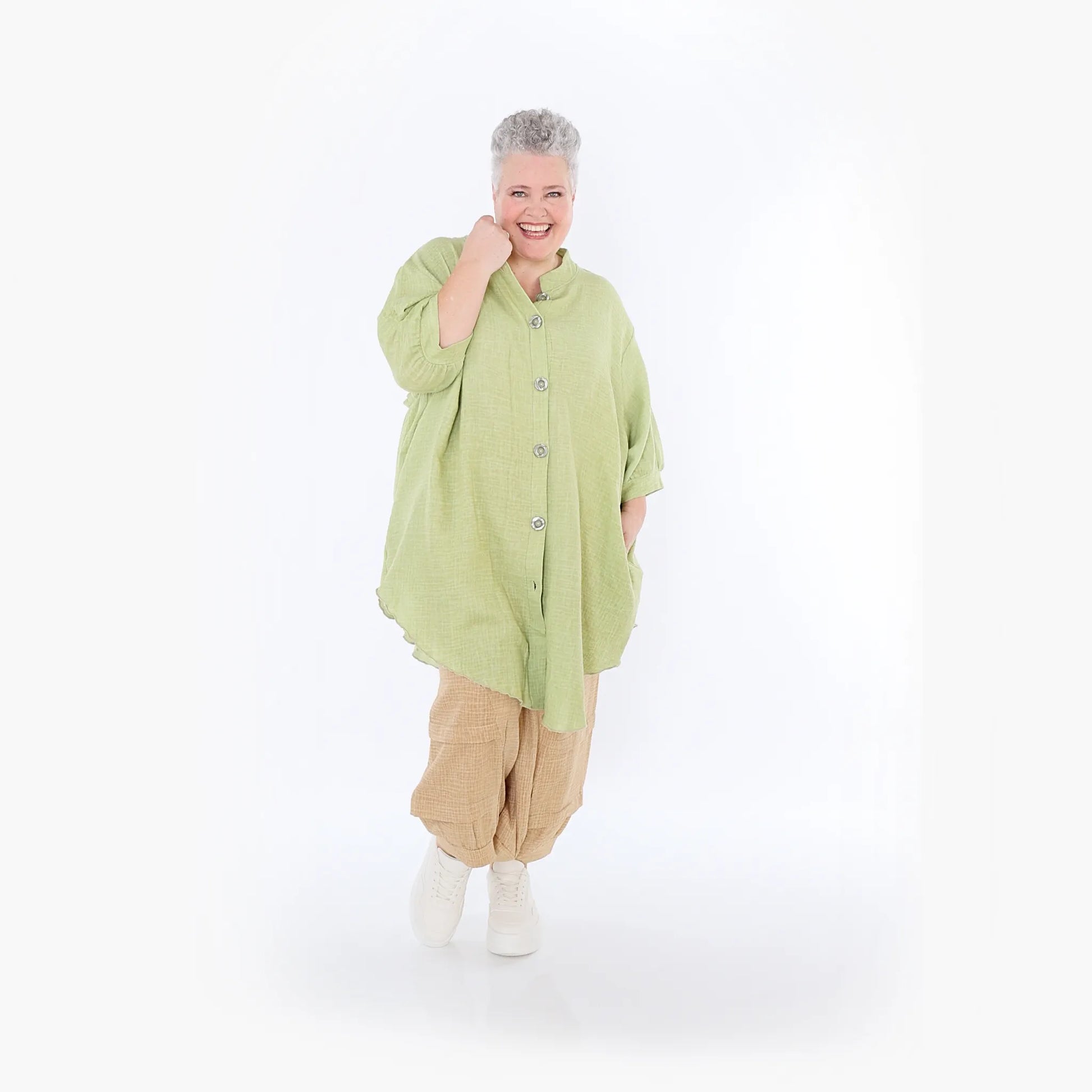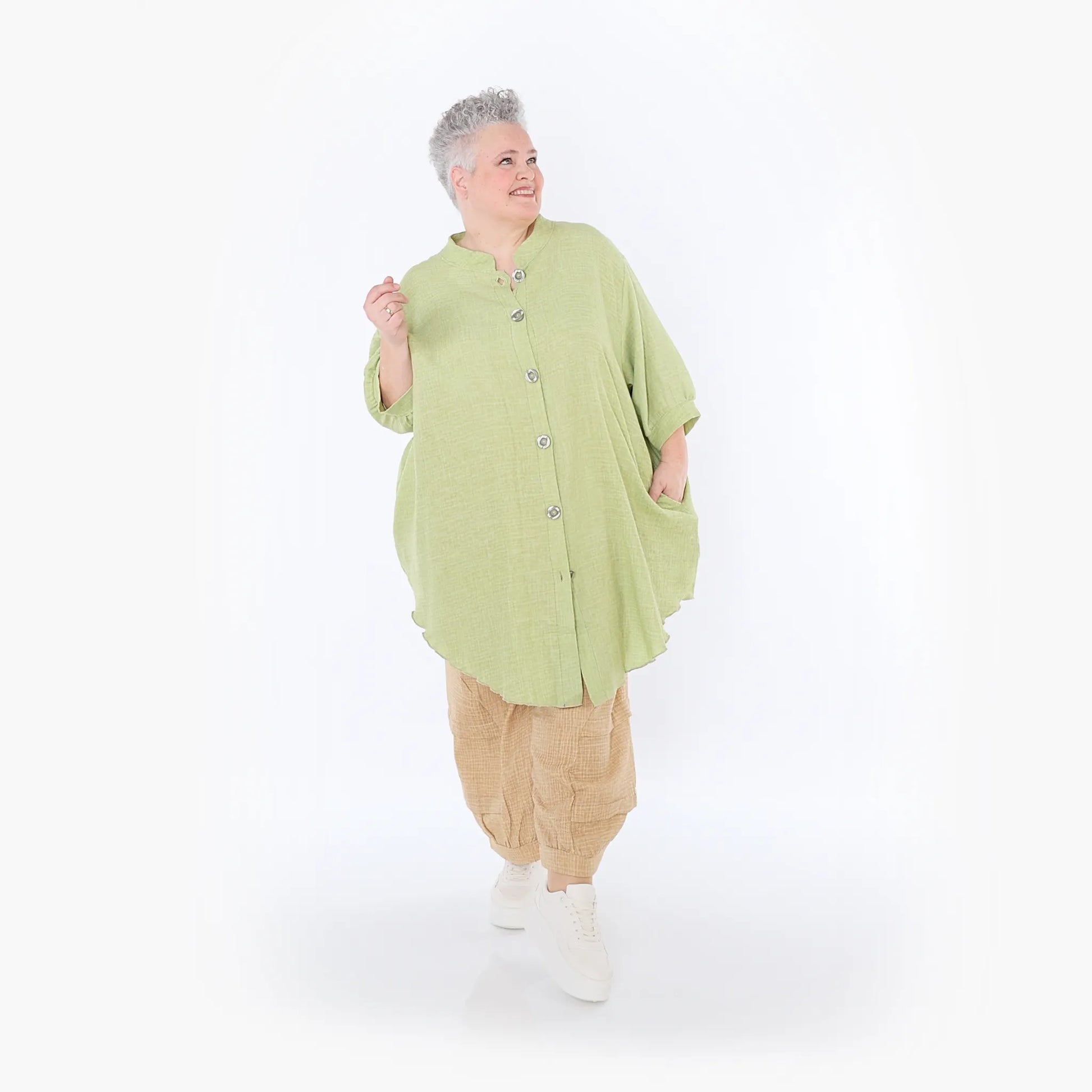 AKH Fashion Bluse, Einheitsgröße, passend bis EU-Größe 56, wird gern auch von Kundinnen mit kleineren Größen oversized bzw. locker, leger getragen.